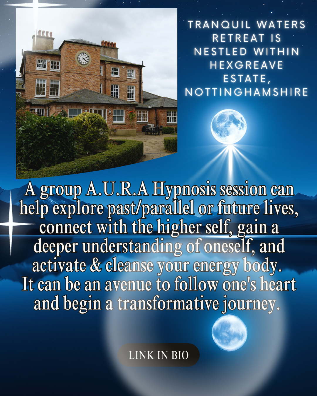 This Group A.U.R.A Session will be held within the beautiful Tranquil Waters Retreat, Nottinghamshire and also Online Via Zoom link.